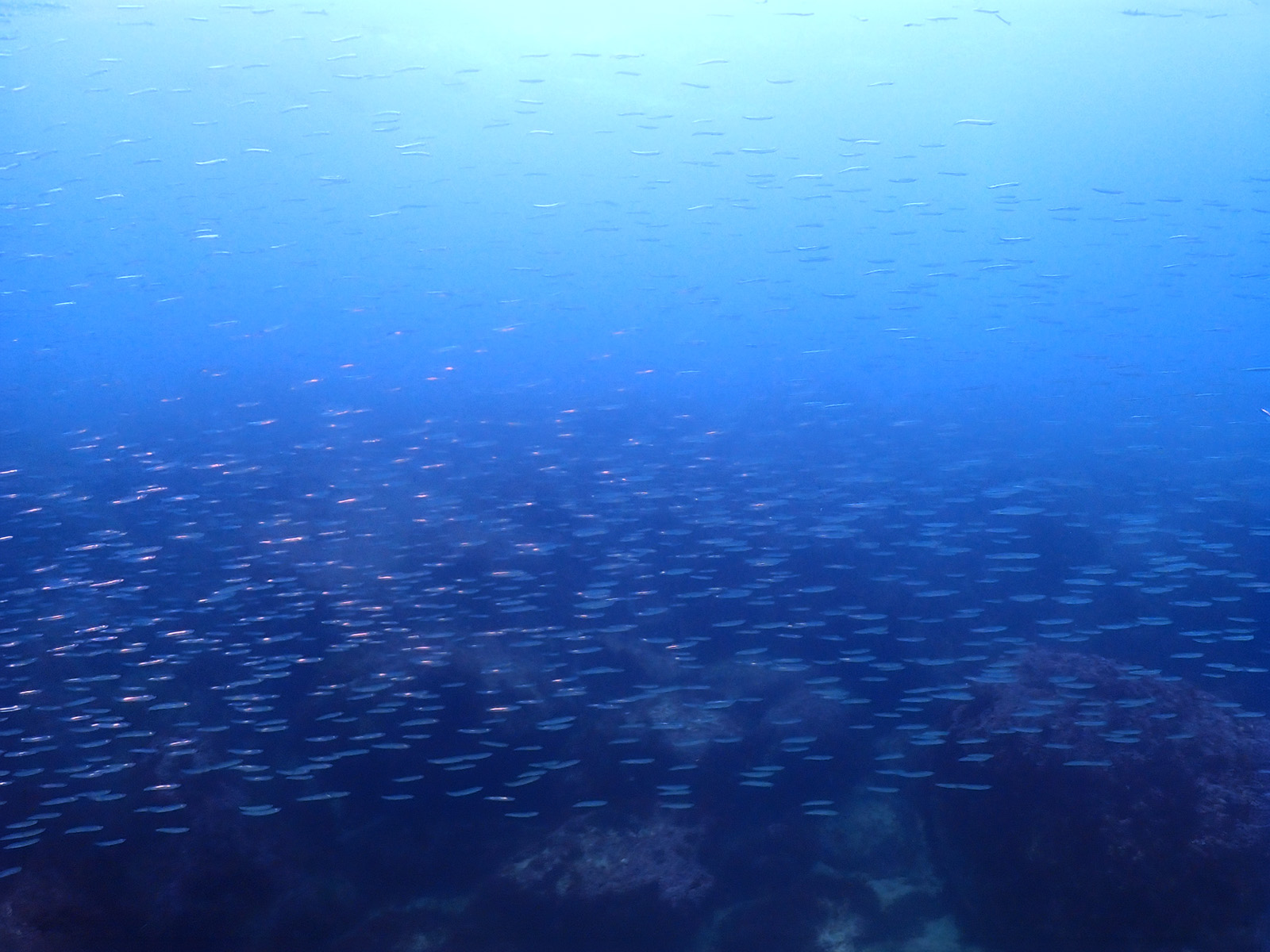 エントリースロープからガイドロープに沿って真っすぐ砂地に向かうとキビナゴが群れています♪
