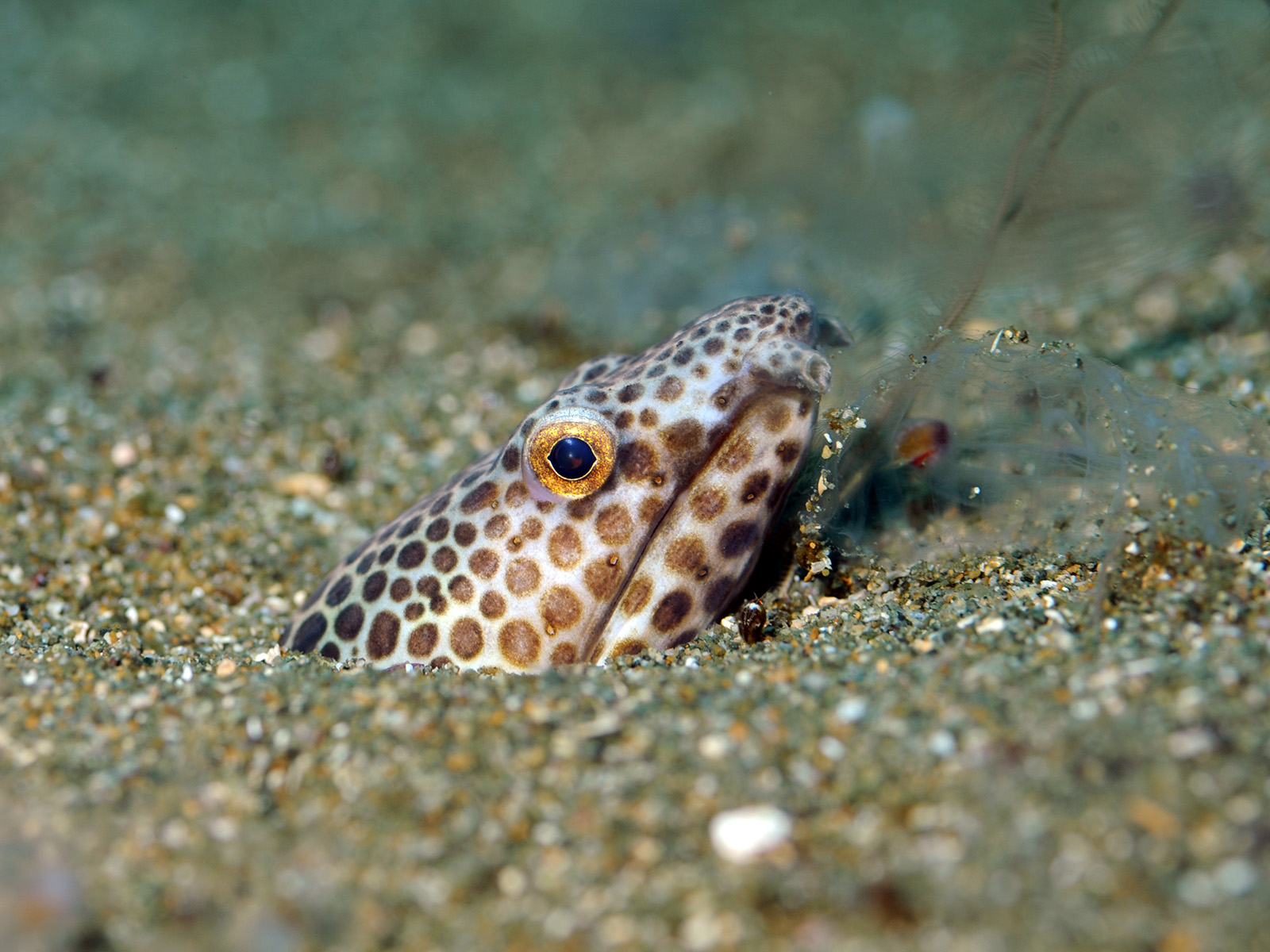 砂地から顔だけ出しているモンガラドオシ