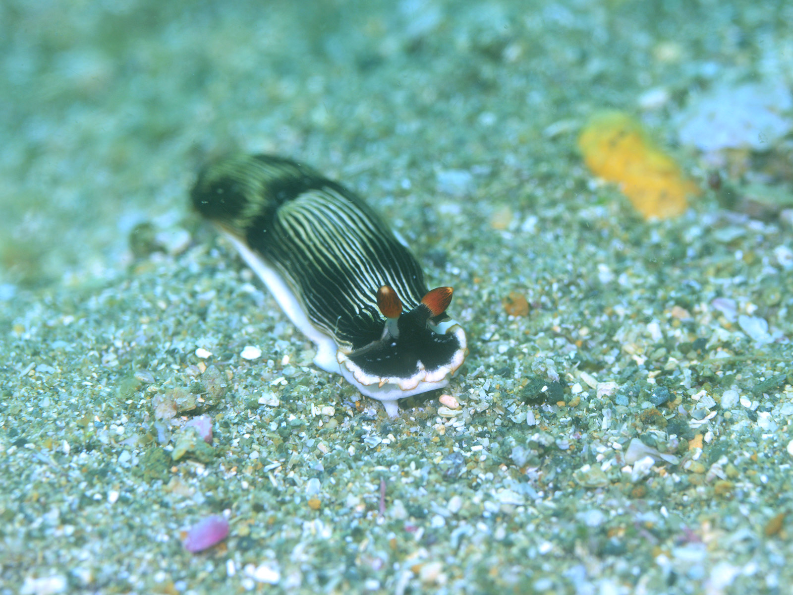 触角の下には縞模様がなく、外套膜もほとんど白一色、触角がオレンジ色のウミウシは図鑑にも載っていません。