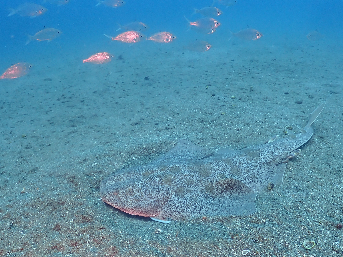 水深18m付近で白い物体を発見!最初サムクラゲの大きいのかと思って近寄っていったらなんと!マンボウでした~!超久しぶりの再会!体長1.2m!悠々と「御黄金」方面に泳いでいきました~♪また会えるといいな~😃