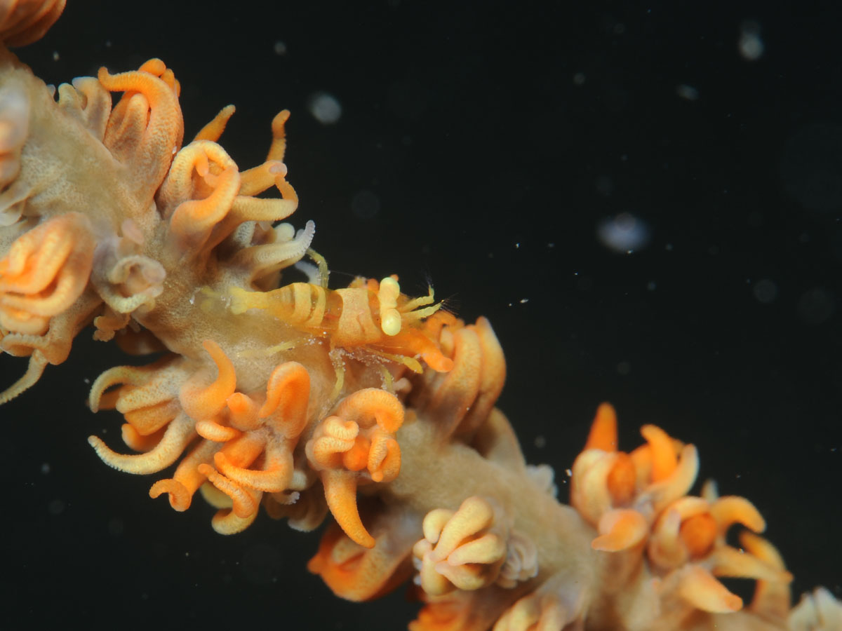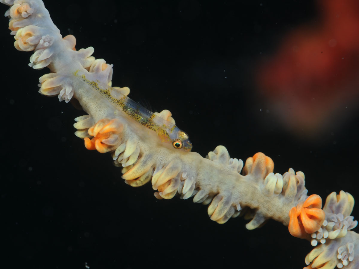 同じムチヤギにどちらも極小サイズのムチカラマツエビとガラスハゼが住み着きました♪