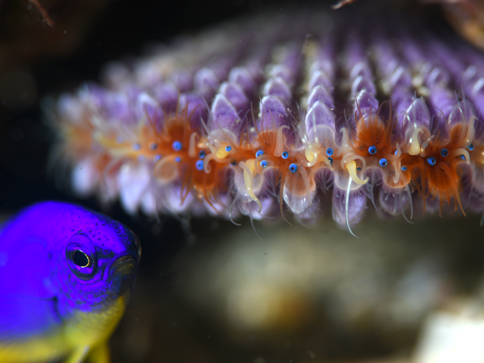 ちょろちょろ周りを泳いているソラスズメダイのおかげで、貝が閉じてします・・・