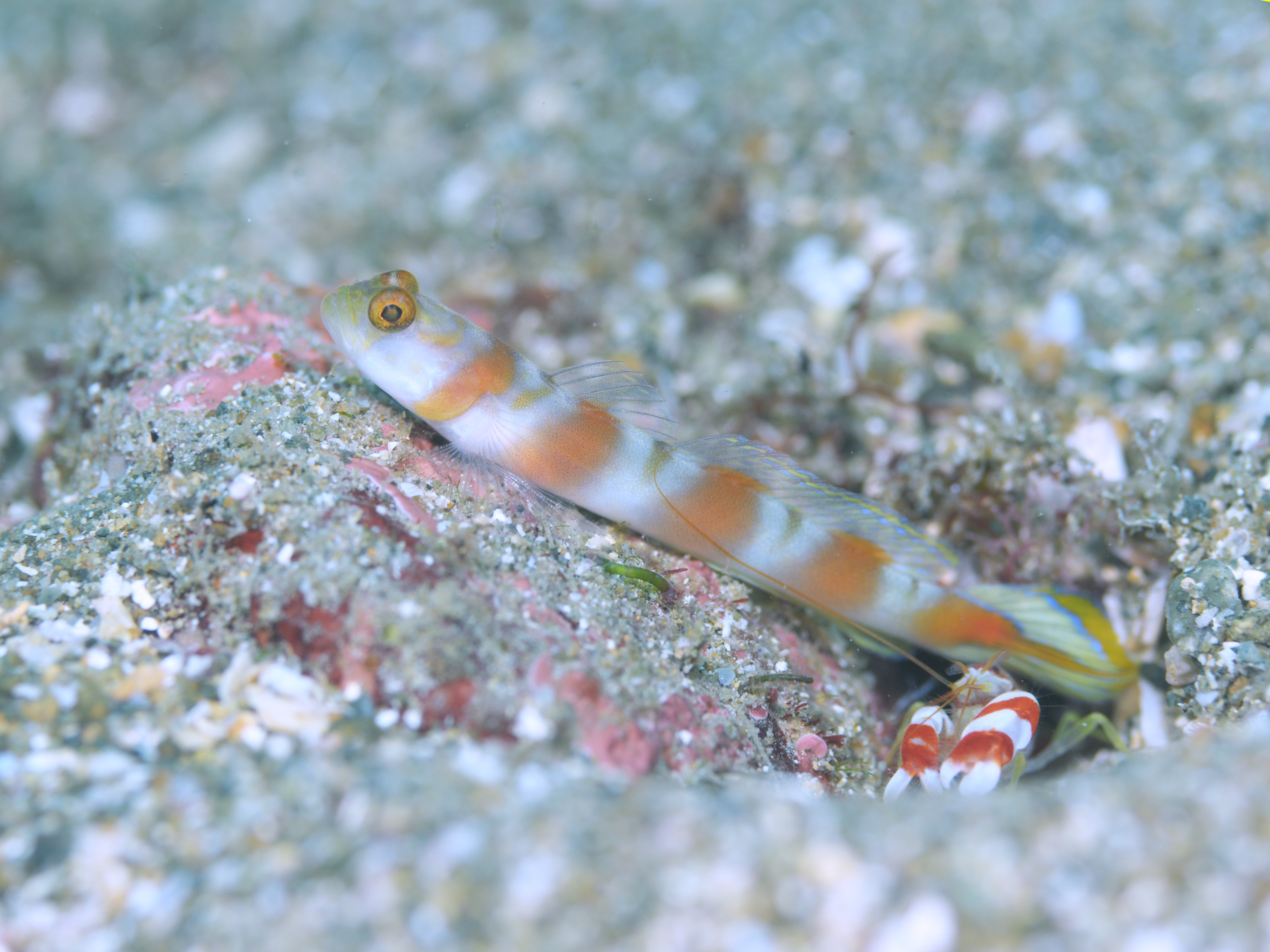 近寄っても巣穴に逃げこむ気配もなくコトブキテッポウエビもどんどん出てきます。
