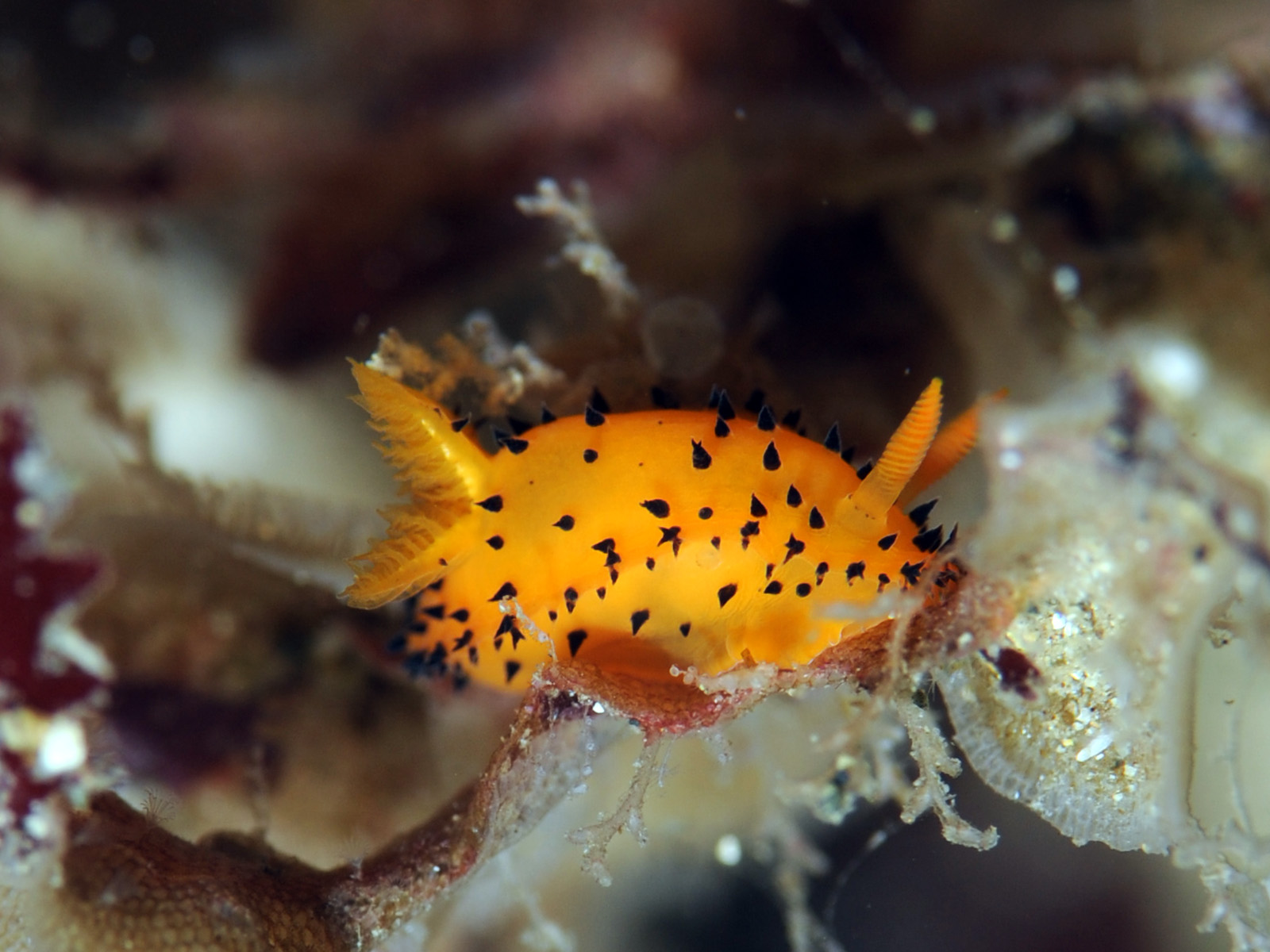 黄色い体色で黒色の小突起が特徴のヤグルマウミウシ😮