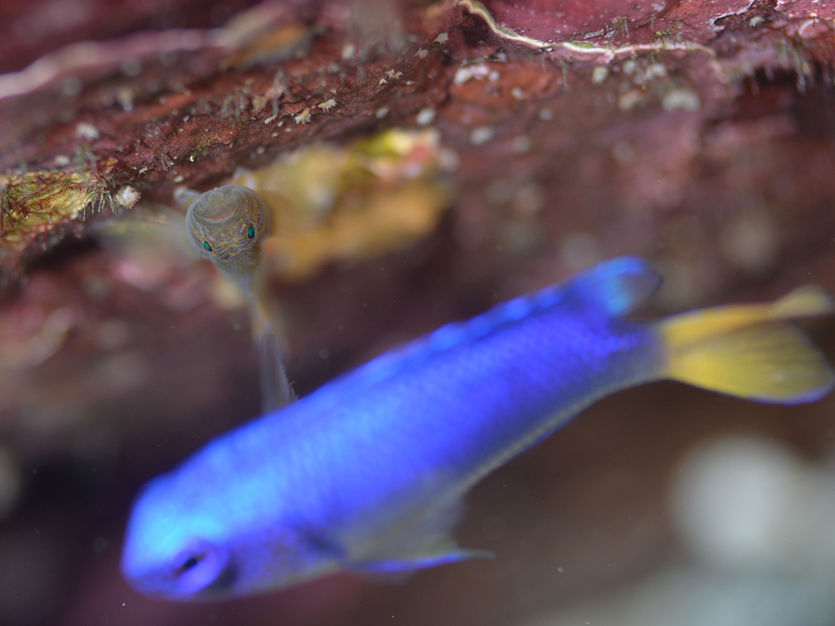 岩の隙間にで見つけたので撮ろうとした瞬間にソラスズメダイが乱入~