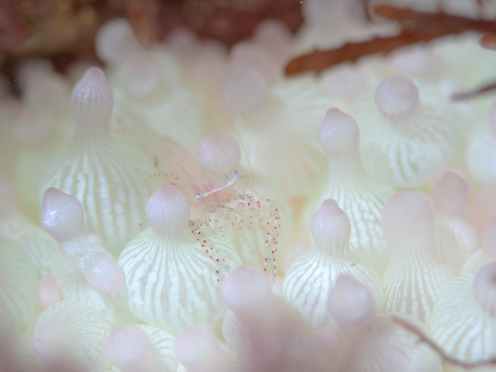 以前、小さなクマノミが住んでいたイソギンチャクにいるカザリイソギンチャクエビ♪