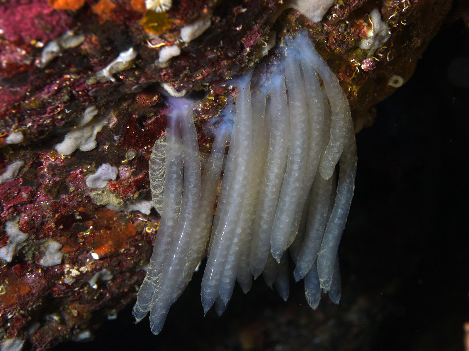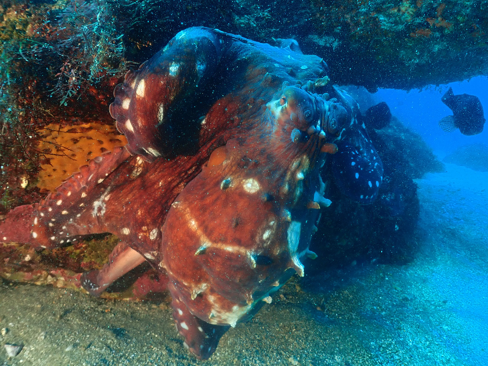 ヤリイカの卵の近くでは大きなワモンダコも!